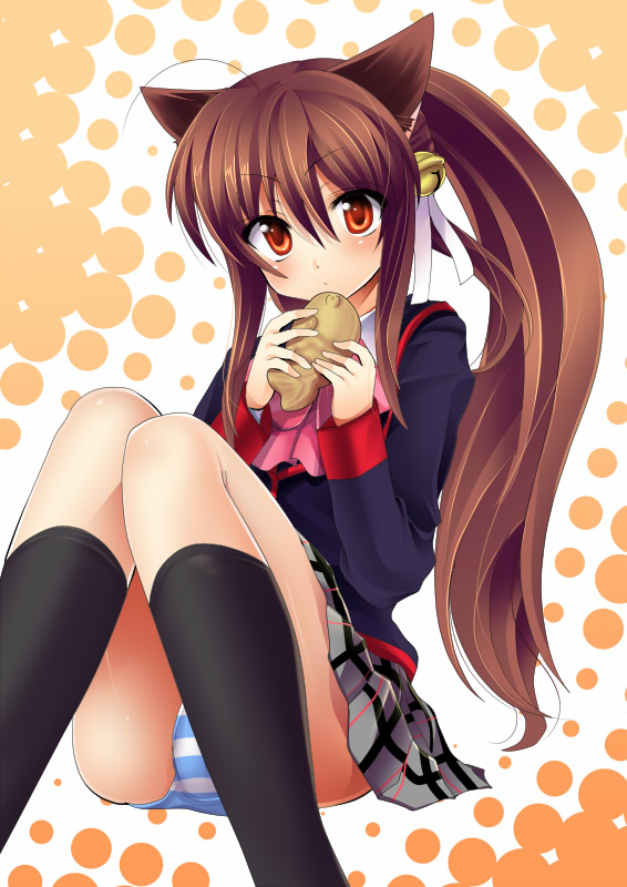 1girlanimal earsbellblack socksbowbrown haircat earsfemale focusfoodkneehighslong hairpantiespink bowplaid clothesplaid skirtponytailred eyesschool uniformskirtsockssolostriped clothesstriped pantiestaiyakiunderwearwagashi