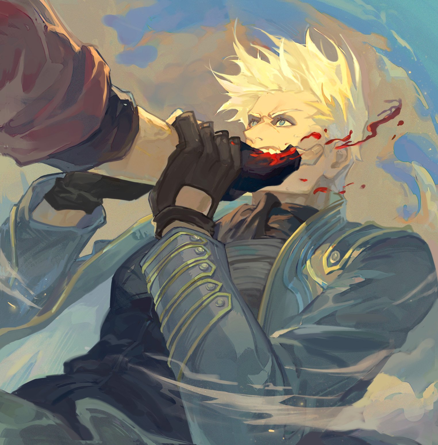 2boysbitingbiting another's handblack glovesblack shirtbloodblue coatblue eyesblue vestbrothersclothing cutoutcoatdutch anglefloating hairglove cutoutgloveshand in another's mouthhands on another's armlong sleevesmale focusmultiple boysout of frameoutstretched armshirtshort hairsiblingssmokesolo focusteethtwinsvestwhite hair