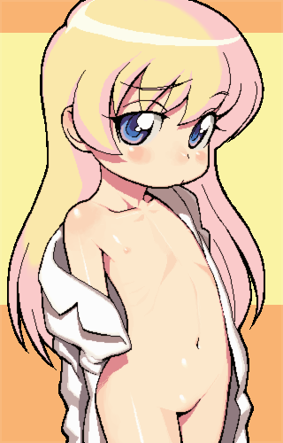 00s1boy1girlblonde hairblue eyesblushcocked eyebrowfemale focusflat chestjaggy lineslolilong hairnavelnipplesnudeoekakisoloundressing
