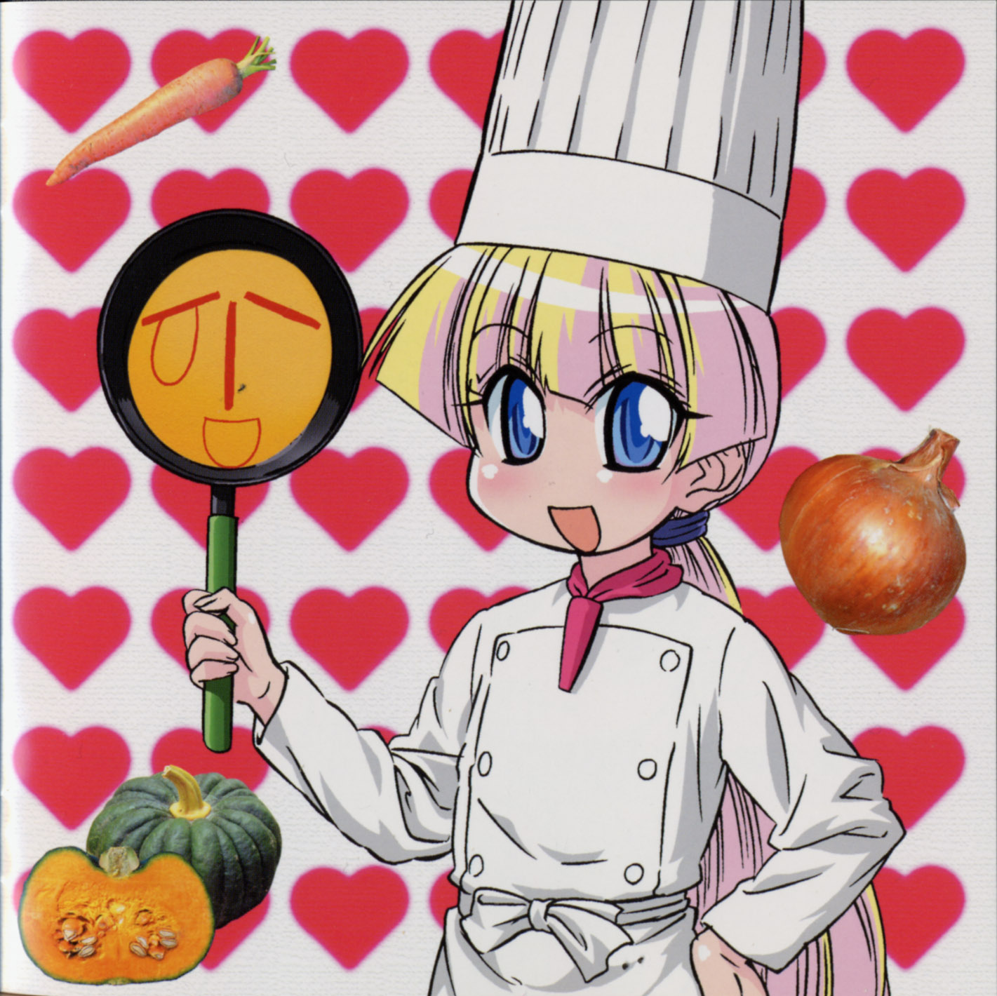 00salbum coverblonde hairblue eyescarrotchefchildcoverfrying panhand on own hipjack-o'-lanternlong hairlow ponytailonionpan (object)ponytailpumpkinsolovery long hair