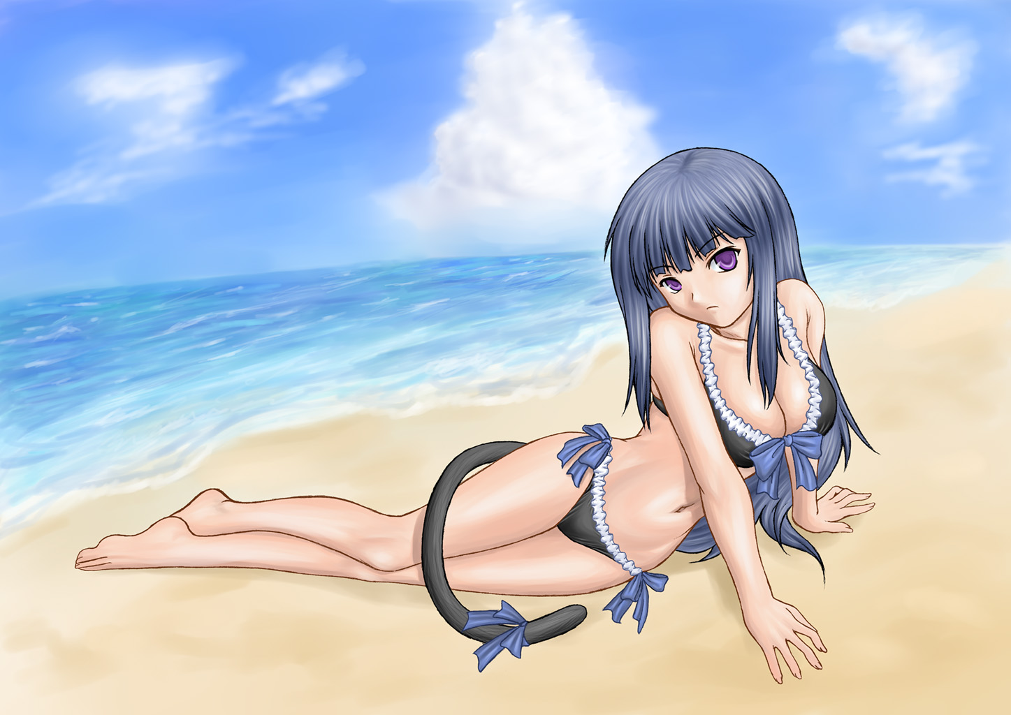 00s1girlbarefootbikiniblue hairbreastscleavagedayfemale focushalternecklarge breastspurple eyesside-tie bikini bottomsoloswimsuit