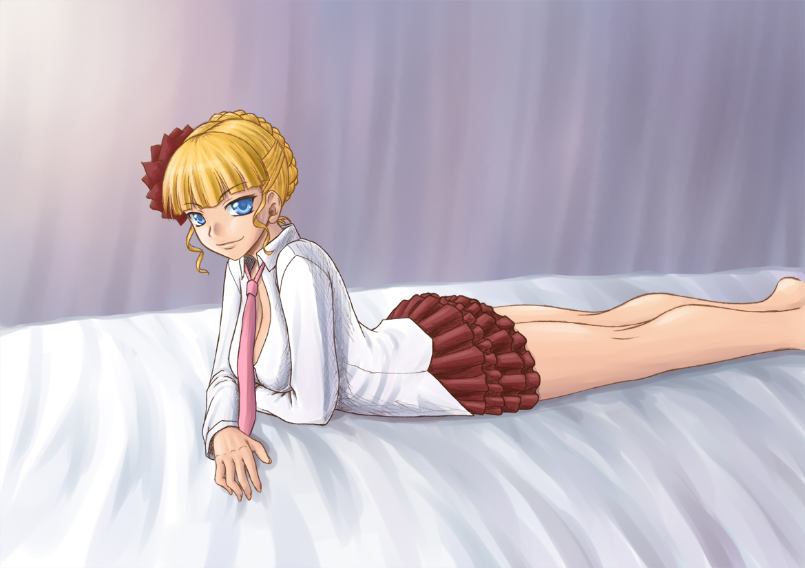 00s1girlbarefootblonde hairblue eyesfemale focuslyingnecktieon stomachopen clothesopen shirtpink necktieshirtskirtsolo