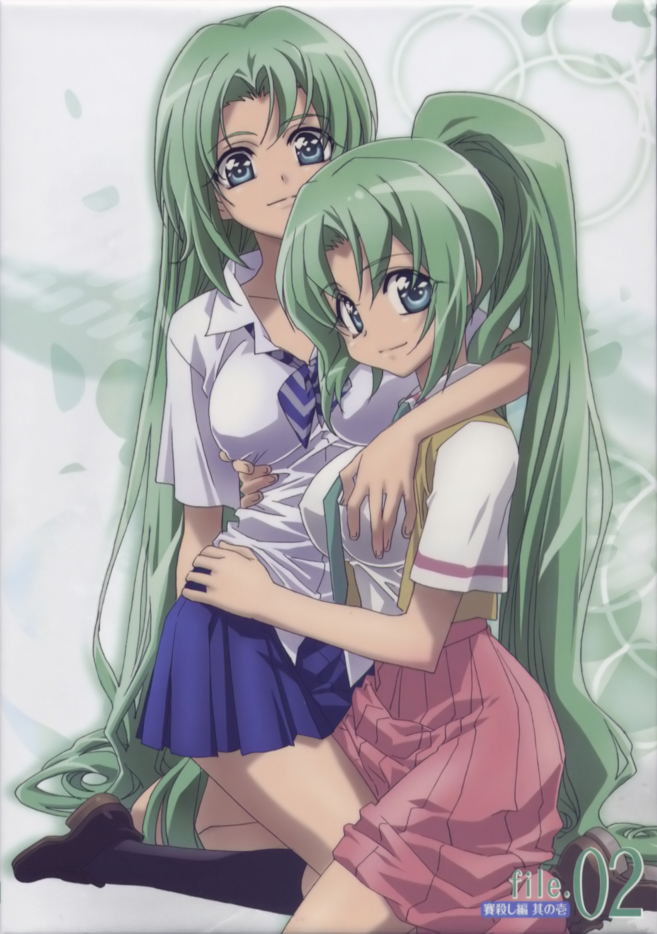 00s2girlsaqua eyesgrabbing another's breastgreen eyesgreen hairgropinghugkneelinglong hairmultiple girlsponytailschool uniformshoessiblingssisterssmiletwinsvery long hair