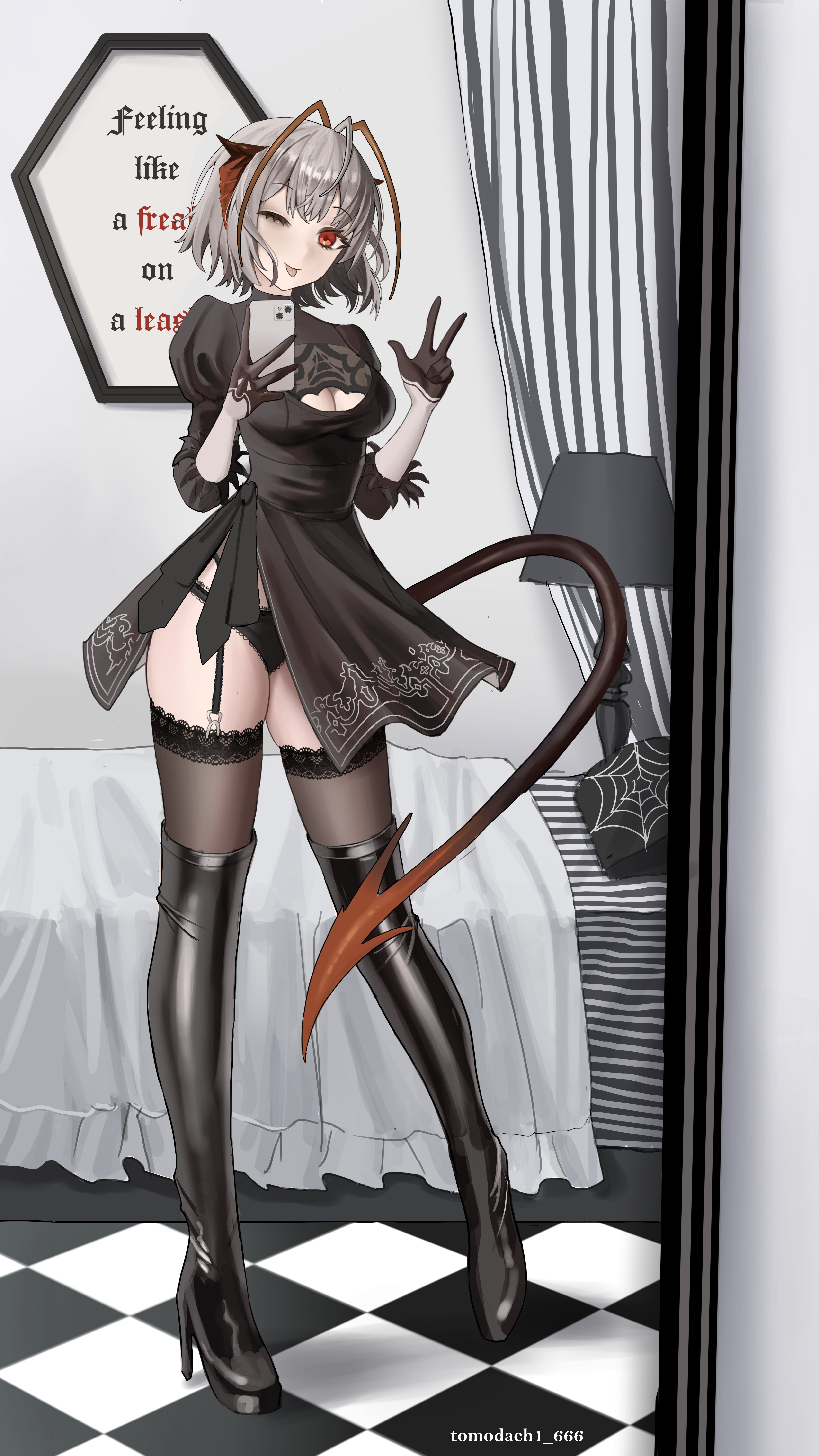 :p1girl2b (nier:automata) (cosplay)antenna hairbedblack dressblack pantiesbootsbreastscellphonecheckered floorcleavagecleavage cutoutclothing cutoutcosplaydemon hornsdemon taildressfeather-trimmed sleevesglovesgrey hairholdingholding phonehornslamplooking at viewermirrorone eye closedpantiesphonered eyesred hornsshort hairsmartphonesolotailthigh bootsthighhighsthighhighs under bootstonguetongue outtwitter usernameunderwearw