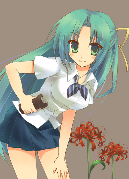 00s1girlelectroshock weaponfemale focusflowergreen eyesgreen hairhair ribbonhalf updoleaning forwardless-than-lethal weaponlong hairmatching hair/eyesred flowerribbonschool uniformsolospider lilystun guntasertongue