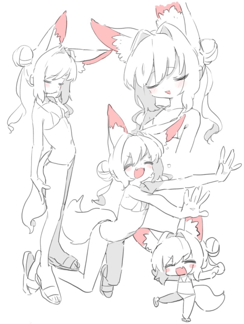 1girlanimalanimal ear fluffanimal earsblushclosed eyesfangflat chestfox earsfox girlfox tailfull bodyhair bunlaughingtailwhite background