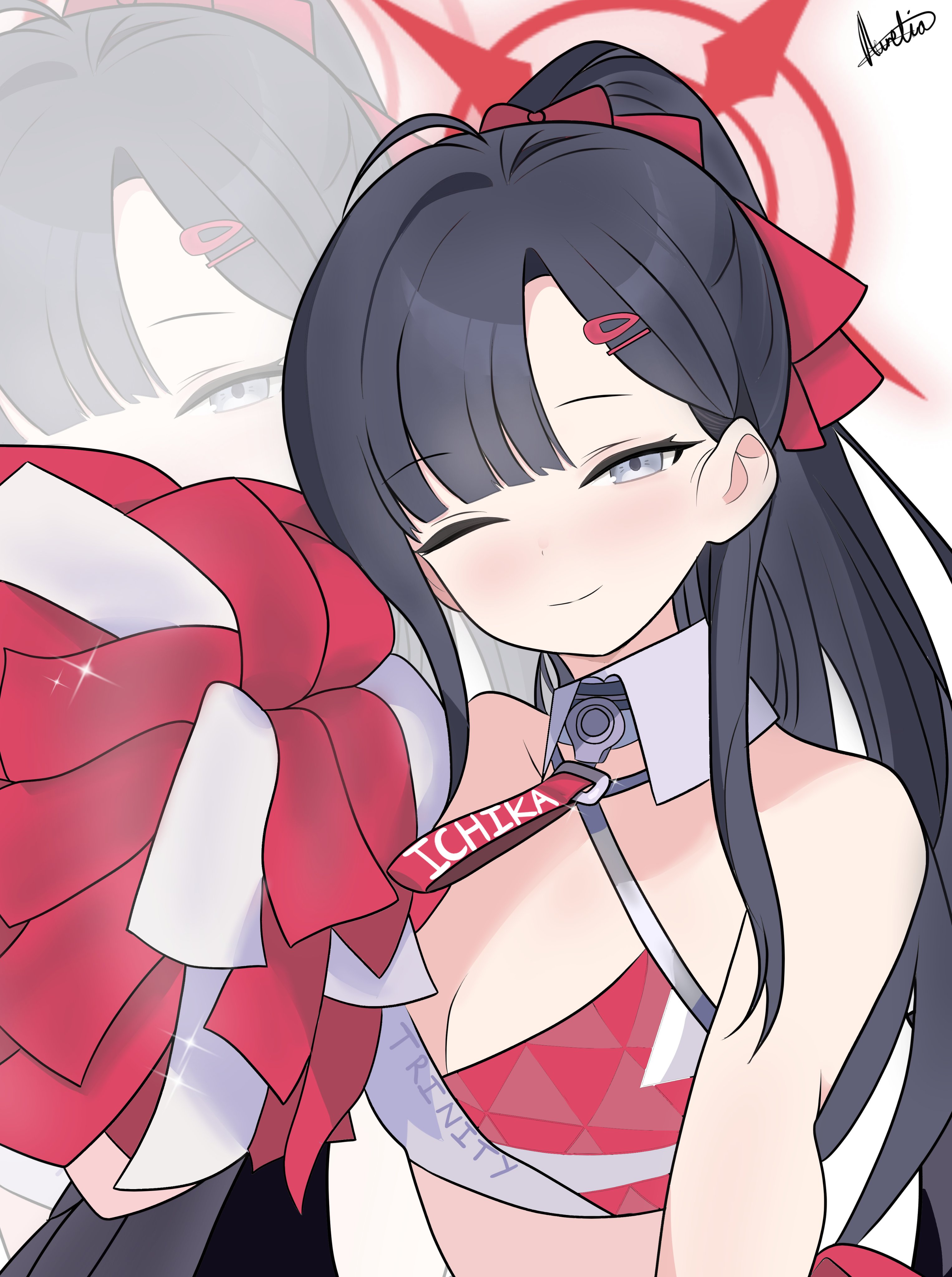 1boy1girlalternate hairstylebare shouldersblunt bangsbowbreastscharacter namecheerleadercleavageclosed mouthdetached collargrey eyeshair behind earhair ornamenthaircliphalohand upholdingholding pom pomslong hairmillennium science school logoone eye closedparallel hairclipspom pom (cheerleading)pom pomsponytailred bowred halosidelockssignaturesmall breastssmilesolosparklesplit mouthsports braunusually open eyesupper bodyvery long hairzoom layer