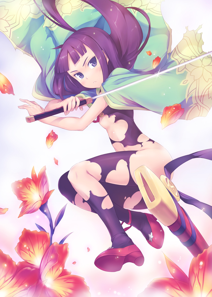 1girlfemale focusflat chestfloro (7th dragon)flowerkatanalong hairpurple eyespurple hairsoloswordtorn clothesweapon