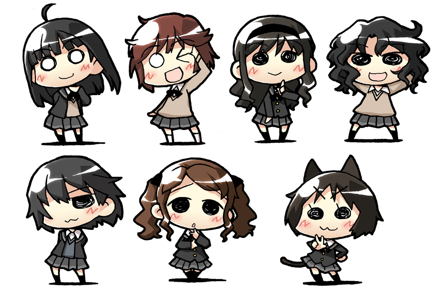 :36+girlsanimal earsbrown haircat earscat tailchibiemphasis lineseveryonefull bodylong hairlong sleeveslooking at viewermultiple girlso osimple backgroundspread legsstandingsurprisedtailtwintailsvery long hairwhite background