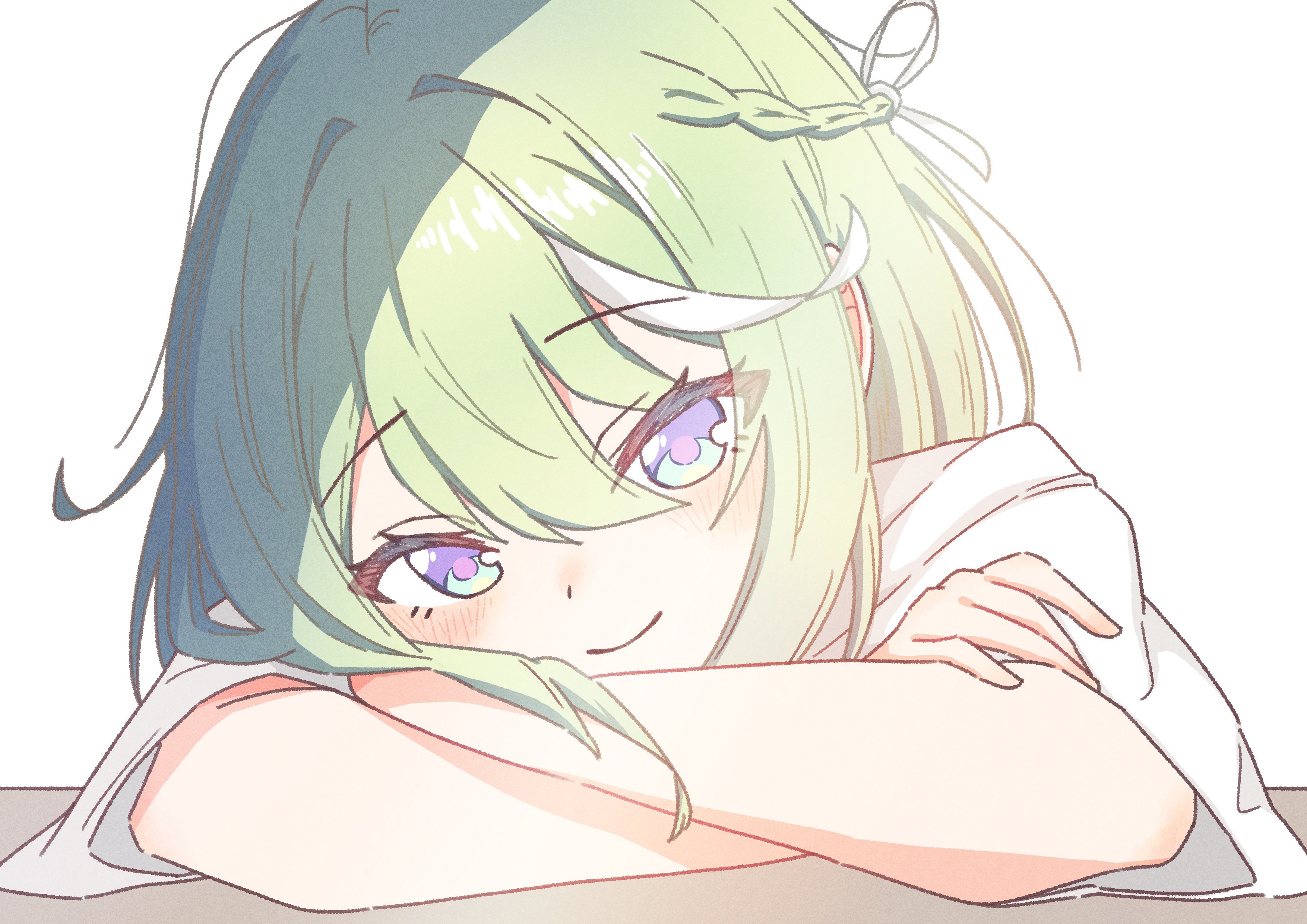 1girlblushbraidclosed mouthcrossed armsfilm graingreen hairhair between eyeshalf up braidlong bangslong hairmulticolored hairpurple eyesshirtshort sleevessimple backgroundsmilesolostreaked hairupper bodyvirtual youtuberwhite backgroundwhite shirt