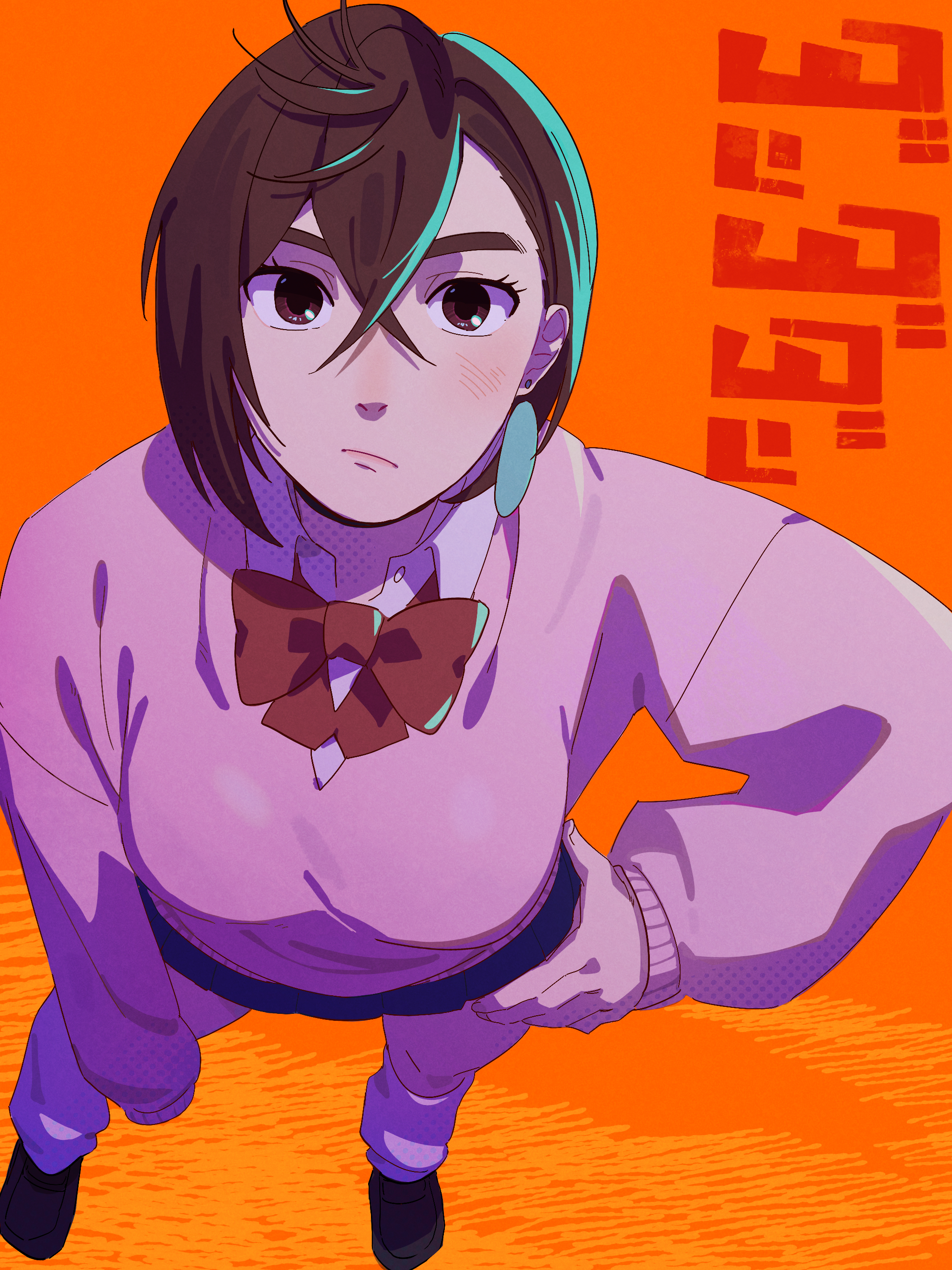 1girlblack chokerblue skirtblushbowbowtiebreastsbrown eyesbrown hairchokerclosed mouthcollared shirtcopyright namecrossed bangsearringsfrom abovefull bodygyaruhair behind earhair between eyeshand on own hipjewelrykami high school uniformlarge breastslong sleeveslooking at viewerloose bowtieloose socksminiskirtnasubi (user agpx4547)orange backgroundpink sweaterpleated skirtred bowred bowtieschool uniformshirtshirt under sweatershort hairskirtsleeves past wristssockssolostandingstraight-onsweaterthick eyebrowswhite shirtwhite socks