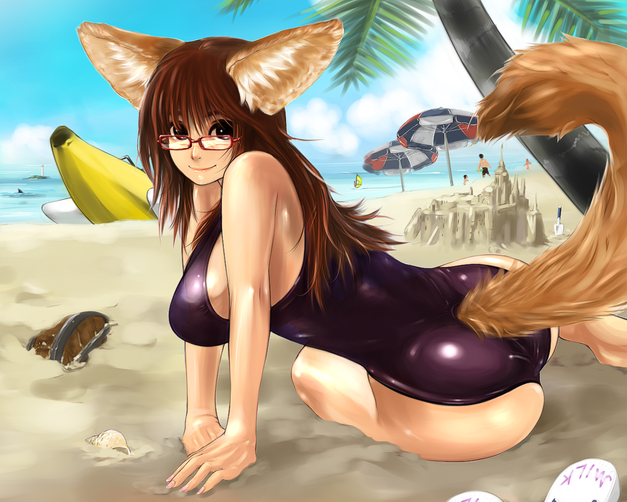 1girlanimal earsassbarefootbeachbreastsdayfemale focusglasseslarge breastsone-piece swimsuitsoloswimsuittail