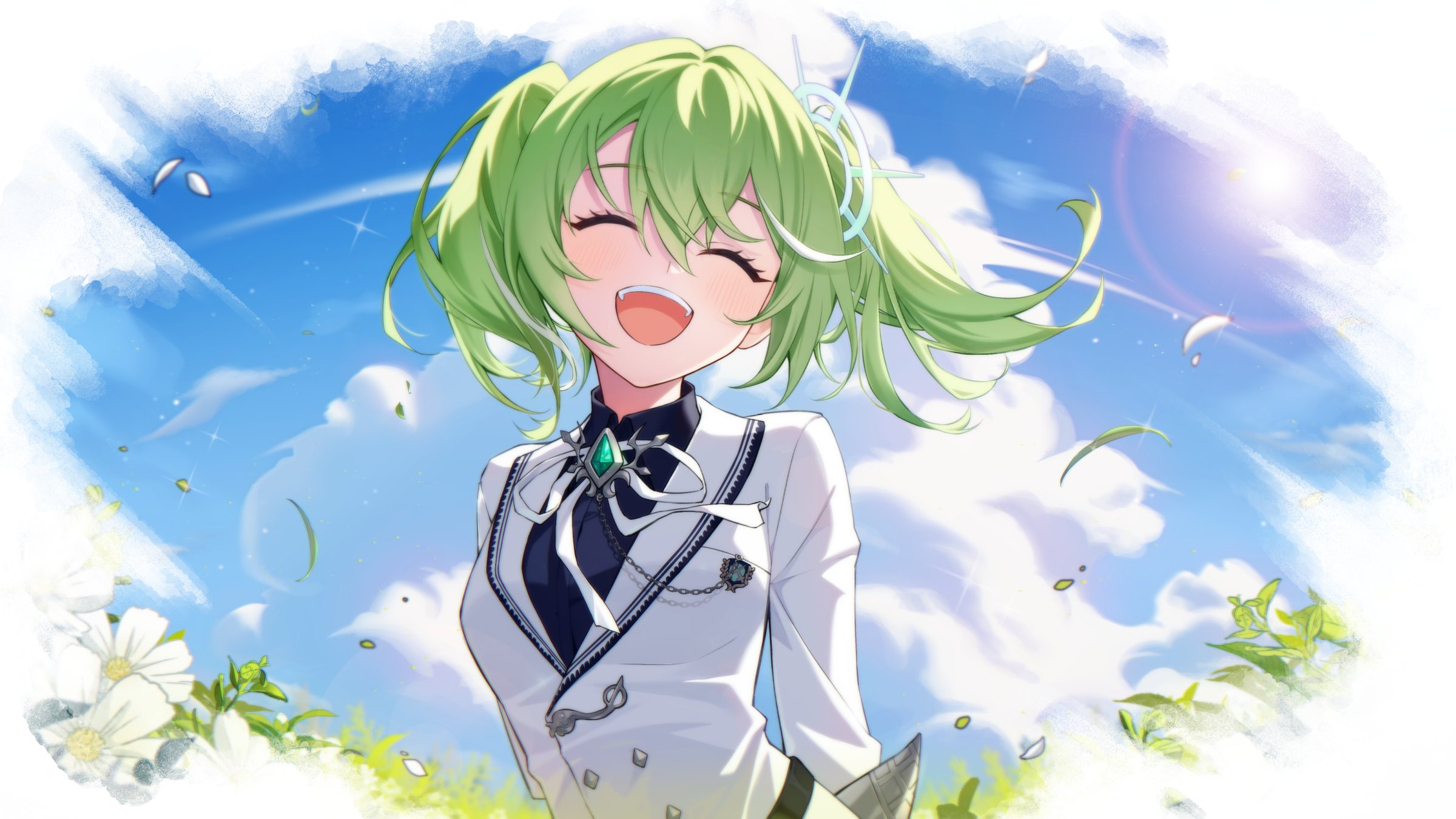 1boy1girlblack shirtblue skyborderbroochclosed eyesclouddaygemgreen gemstonegreen hairhappyjacketjewelrylong sleevesmedium hairneck ribbonopen mouthoutdoorsribbonshirtskysmilesolotwintailsupper bodyvirtual youtuberwhite borderwhite jacketwhite ribbon