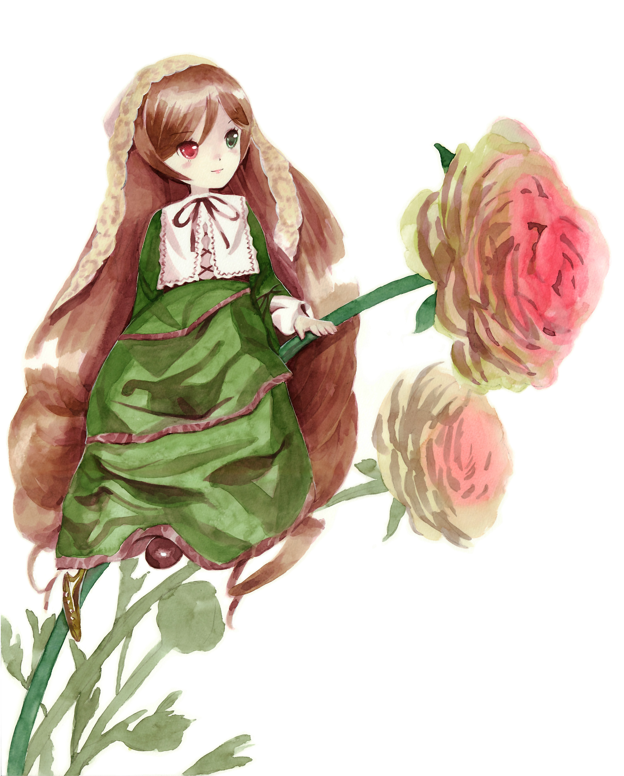 00sbrown hairdressflowerhairbandheadscarfheterochromialong hairmulticolored floweron flowerrosesolovery long hairwhite headscarf