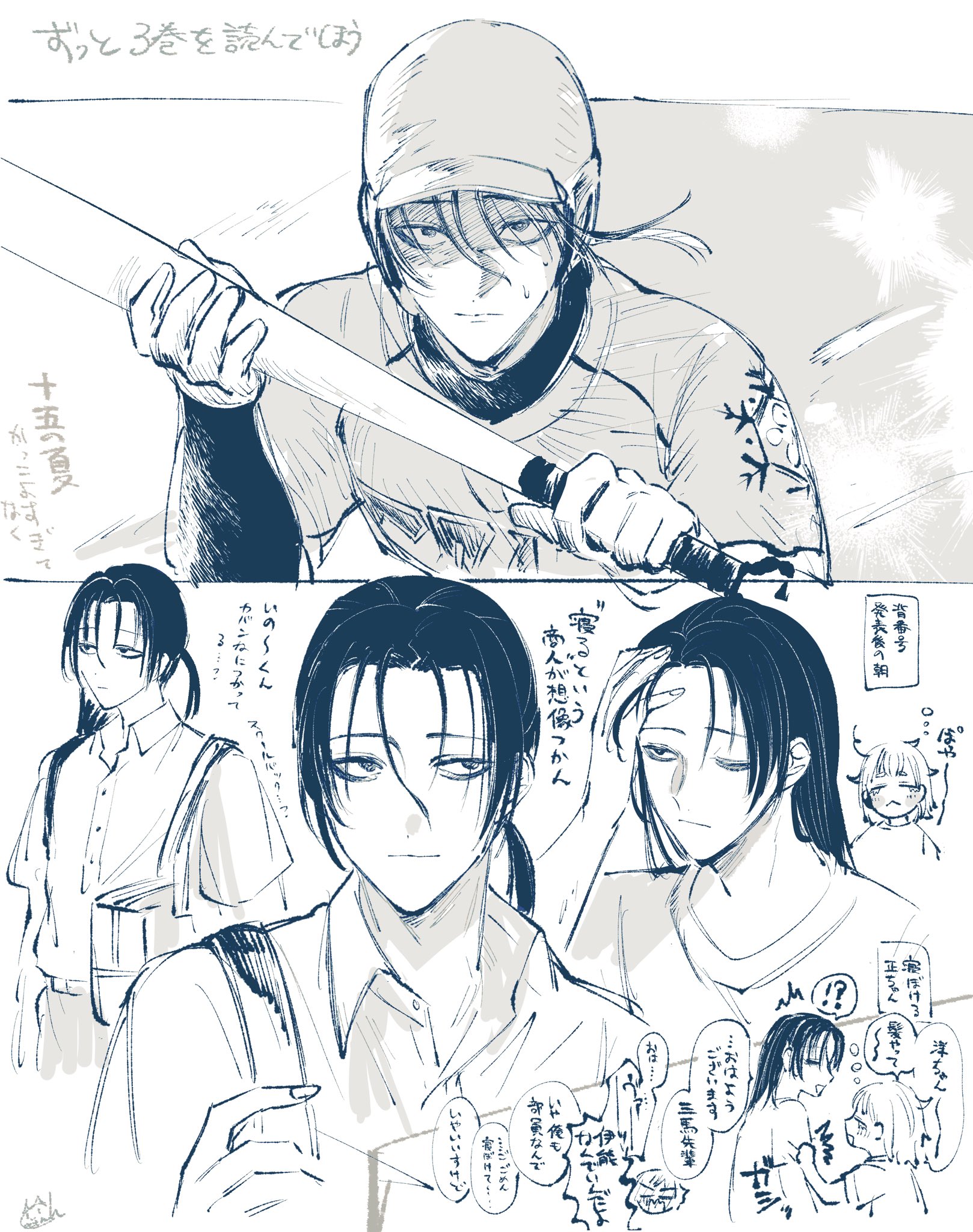 1boy2boysbagbaseballbaseball batbaseball helmetbaseball jerseybaseball uniformclosed mouthcollared shirtdress shirthair downhand on own headheight differencehelmetholdingholding baseball batjerseylong hairlooking to the sidemale focusmonochromemultiple boysmultiple viewsone eye closedparted bangsponytailschool bagshirtshort sleevesshoulder bagspeech bubblesportswearsqueans