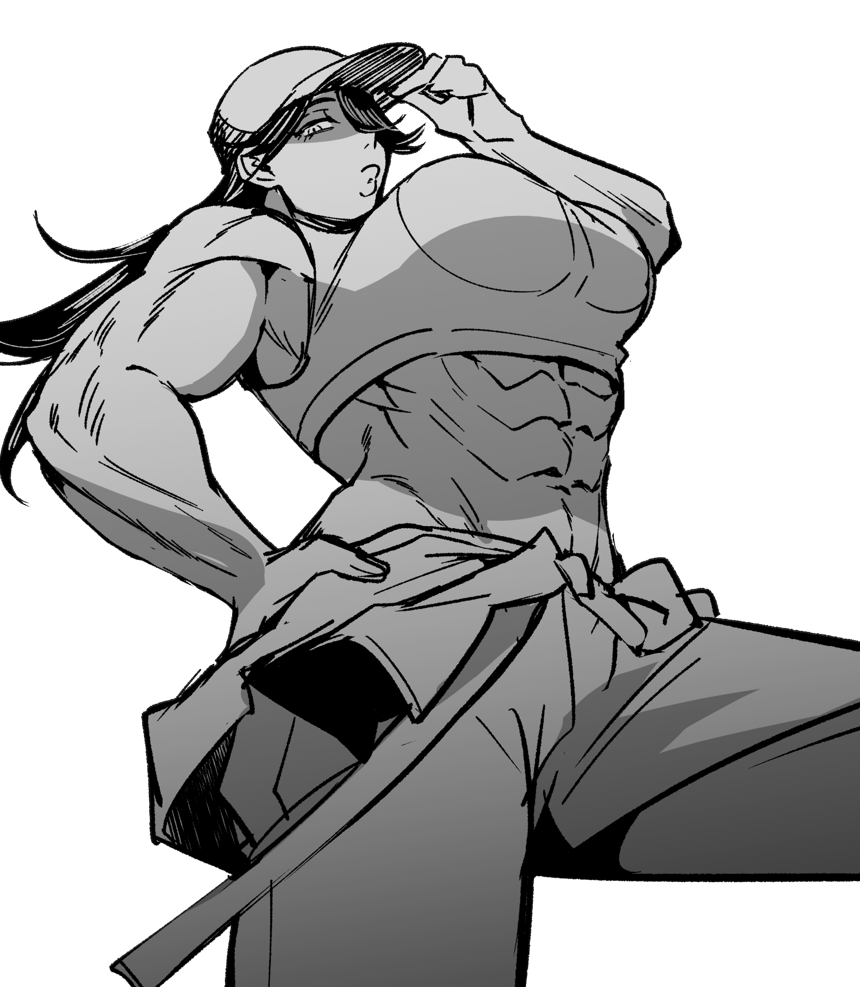 1girlabsbad ass buddiesbare armsbaseball capbreastscowboy shotflipped hairfrom belowgreyscalehair over one eyehand on headwearhand on own hiphatlarge breastsleader (bad ass buddies)long hairlooking at viewermonochromemuscularmuscular femalepantspuckered lipssimple backgroundsolosports brastomachwhite background