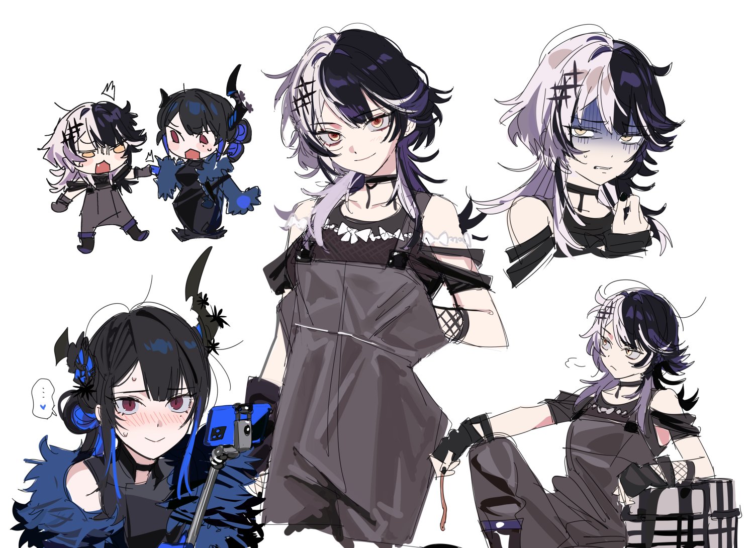 1boy2girlsalternate costumeasymmetrical hornsblack dressblack glovesblack hairblack hoodieblack nailsblue hairblushbreastscellphonechibichibi insetclenched teethclosed eyescolored inner haircropped legsdemon hornsdressfeather boafingerless glovesfingernailsglovesgrey hairhair ornamentheartholdinghoodhoodiehornslong hairlooking at viewermolemole under eyemulticolored hairmultiple girlsmultiple viewsnail polishphonered eyesselfie sticksimple backgroundsmall breastssmartphonesplit-color hairspoken ellipsisspoken heartstandingsweatteethturn paletwo-tone hairuneven hornsvirtual youtuberwaderswhite backgroundwormyellow eyes