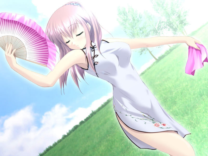 1girlchina dresschinese clothesclosed eyesdancingdressfemale focusfolding fanhand fanholdingholding fanlong hairoutdoorspink hairskysolo