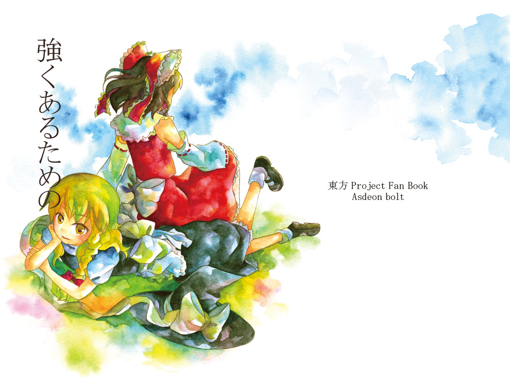 2girlsblonde hairblushbobby socksbowbrown hairfemale focusfull bodyhair bowloaferslyingmultiple girlson stomachpuffy short sleevespuffy sleevesred bowshoesshort sleevessimple backgroundsockstext focuswhite backgroundyellow eyes