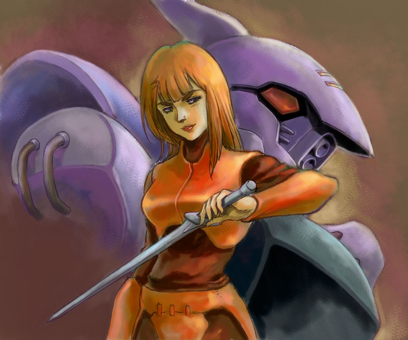 1girlblue eyesfemale focuslipslong hairmechaoldschoolorange hairretro artstylerobotsimple backgroundsoloswordweapon