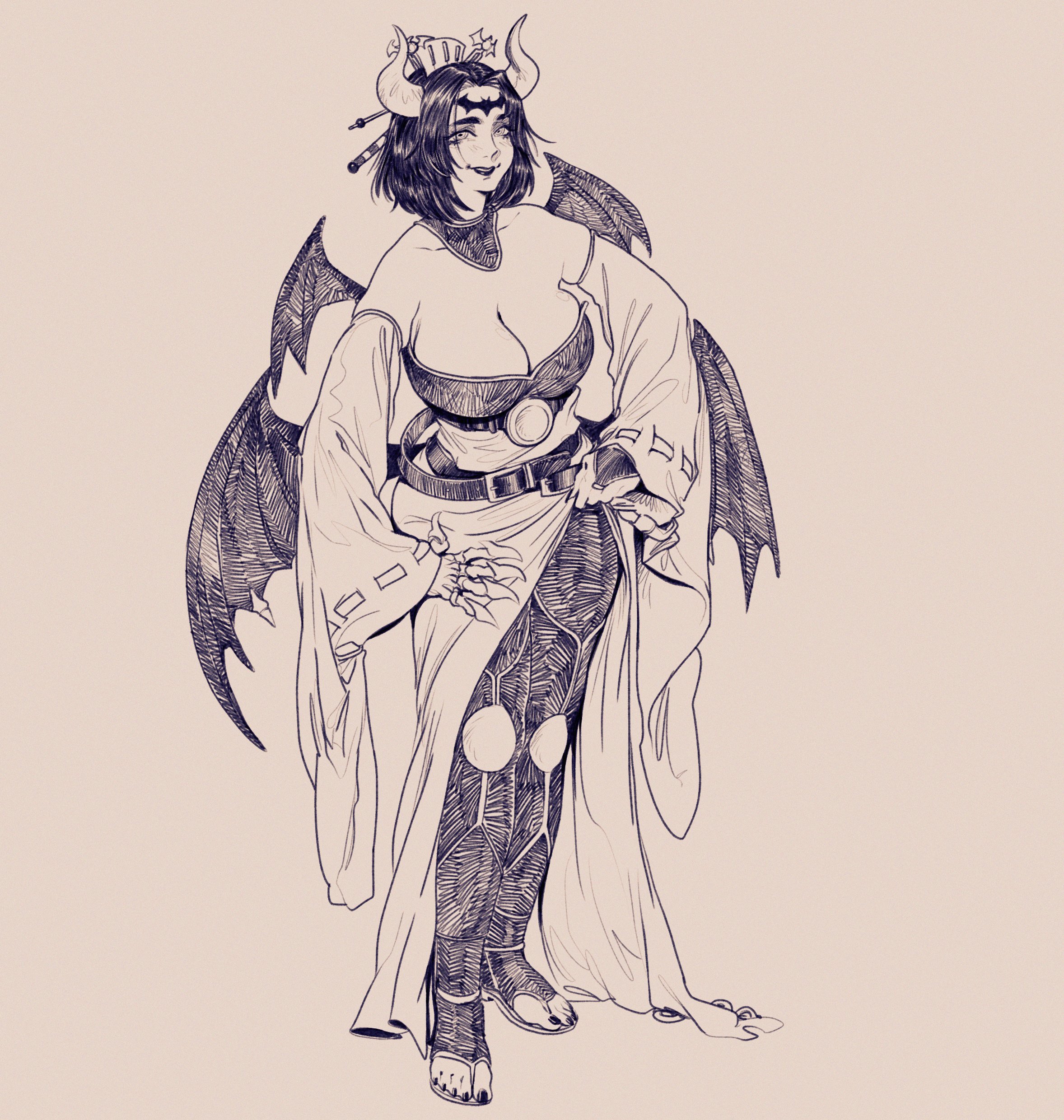1girlbare shouldersbat tattooblack hairbreastscleavagedemondemon girldemon hornsdemon wingsdigimon (creature)eyeshadowfacial markfallen angelforehead markforehead tattoofull bodyhair ornamenthornslarge breastslong sleeveslooking at viewermakeupmonochromemultiple wingsnail polishpiercingpointy earspurple eyeshadowpurple lipsshort hairsimple backgroundsketchsmilesolostandingtattoowing piercingwings