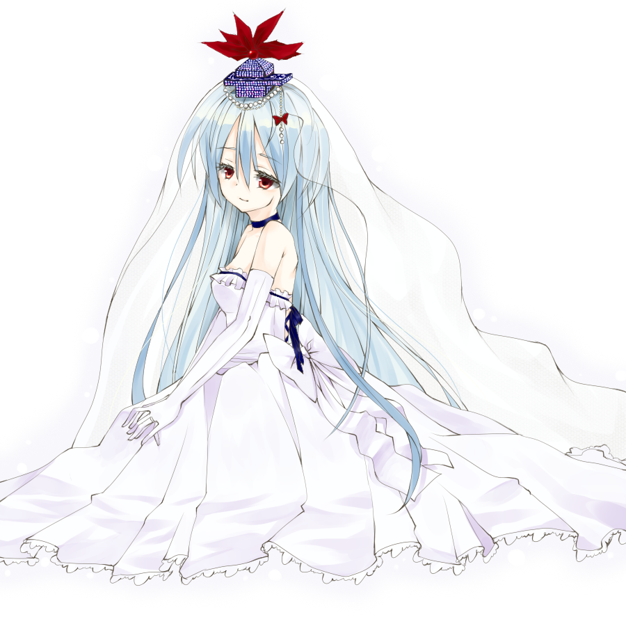 1girlblue hairbreastsbridal veilbridedresselbow glovesfemale focusglovesgradient backgroundlong hairred eyessoloveilwedding dresswhite background