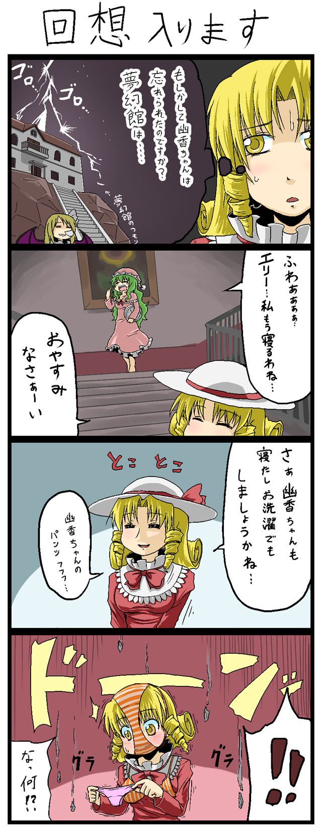 3girls4komabat wingsblonde hairbraclockcomicdrill hairfemale focusfemale pervertflashbackgreen hairhatlingerielong hairmultiple girlsnightcapnightgownnose bubbleobject on headpantiespanties on headpervertpink pantiesshort hairstriped brastriped clothesstriped pantiesunderwearvampirewings