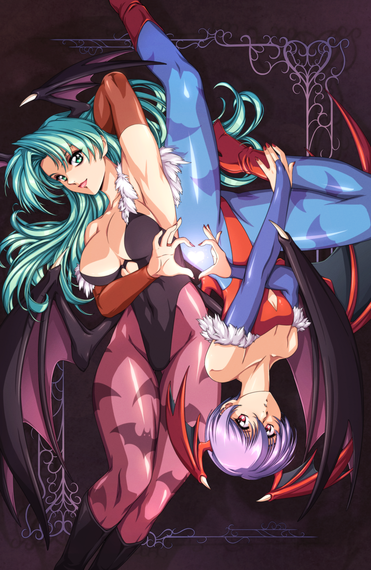 2girlsblack leotardbreastscopyright namedemon girldemon wingsenglish textgreen eyesgreen hairhead wingshighleghighleg leotardleotardlyingmultiple girlspantyhoseprint pantyhosepurple hairpurple pantyhosered eyesred leotardstraplessstrapless leotardwings