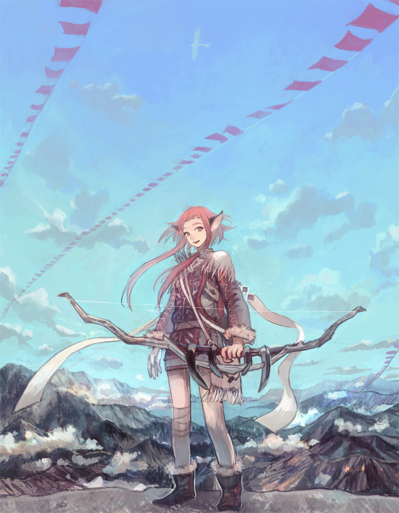 1girlanimal earsbirdbootsbowbow (weapon)brown eyesclouddayfemale focuslong hairmountainorange hairribbonskysmilesnowsoloweapon