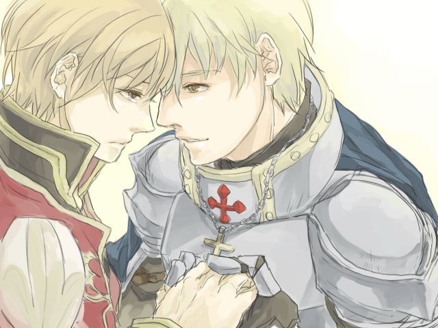 2boysarmorblonde hairblue capebreastplatebrown haircapeclosed mouthcrosscross necklacegrey eyesholding handsjewelrymale focusmitsunorimultiple boysnecklaceopen mouthpauldronsred shirtshirtshort hairshoulder armorupper bodyyaoiyellow eyes