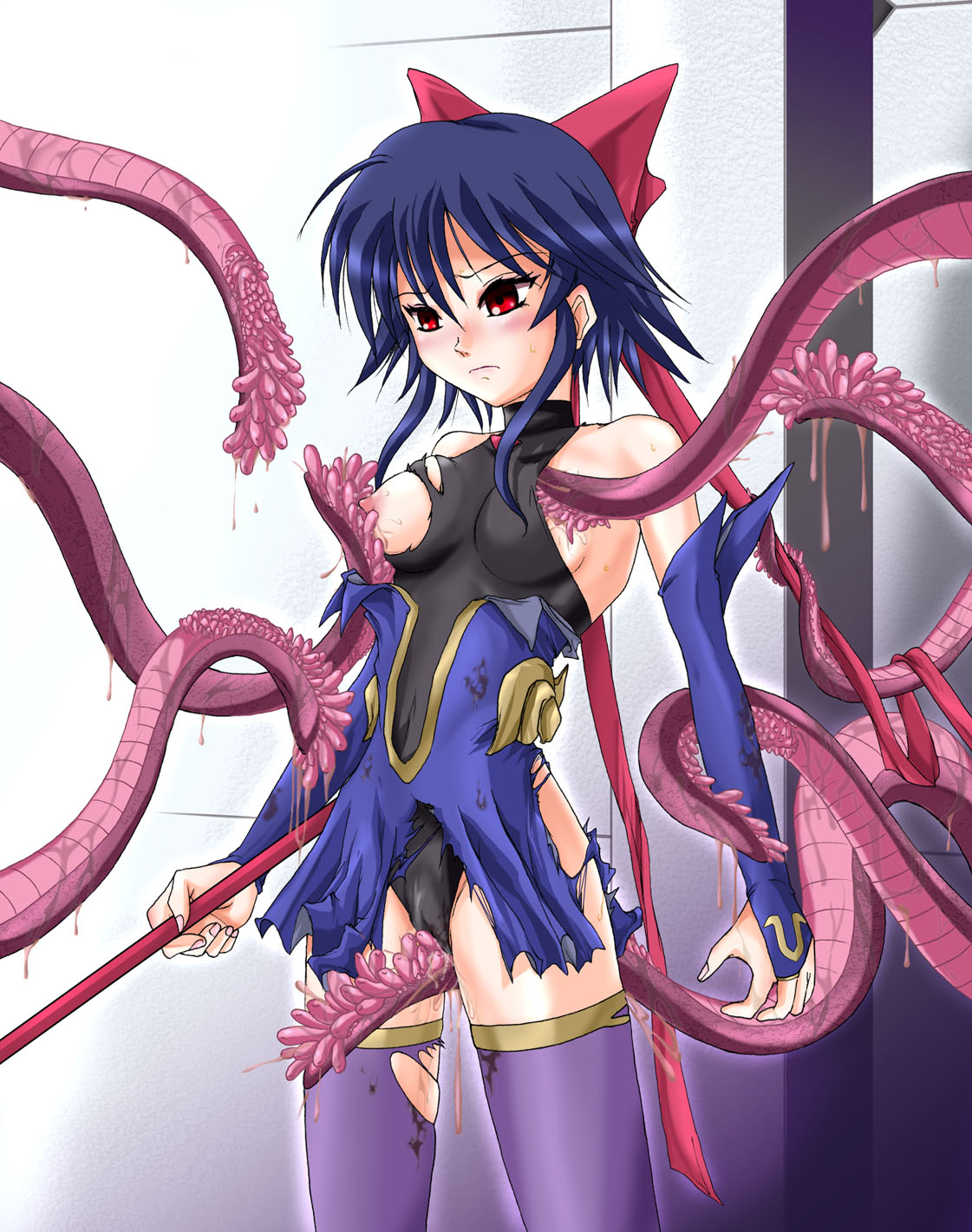 00sblue hairblushbootsbreastsdetached sleevespolearmred eyesribbonshort hairsolospearsweattentaclesthigh bootsthighhighstorn clothesweapon