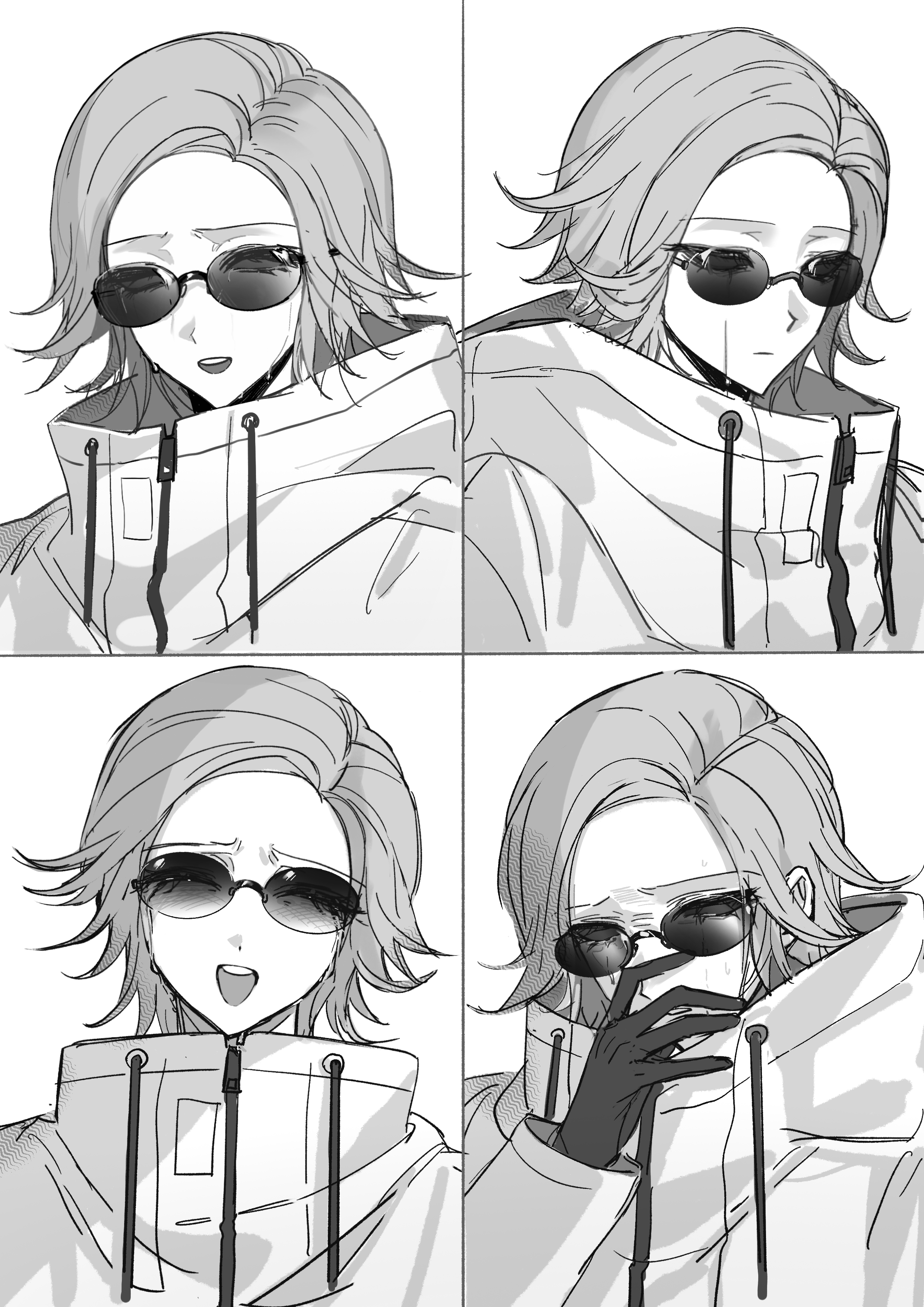 :d1boyblindclosed eyescollagecovering own mouthcryingdiqiubaozhawoshuijuedrawstringfacing viewerglovesgreyscalejacketmale focusmonochromemultiple viewsopen mouthshort hairsimple backgroundsmilesunglassesteethupper bodyupper teeth only