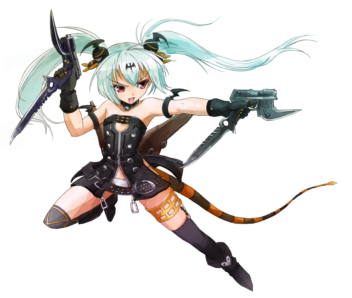 1girlalbinoangryaqua hairarmbandbare shouldersbeltbelt skirtbootschokerfangfemale focusglovesgunbladehair ornamentjewelrylegwear garterlong hairpantiesred eyessolotailthigh bootsthighhighsthighlettwintailsunderwearweaponwhite hairwhite panties