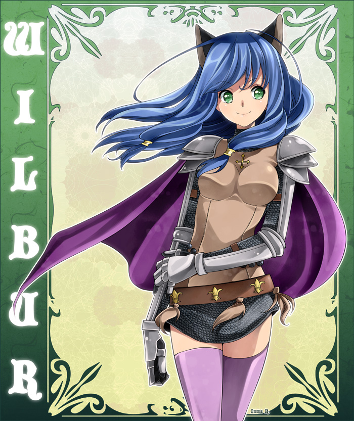 1girlanimal earsarmorblue haircapecat earscat girlchainmailclosed mouthcowboy shotgauntletsgreen eyeslong hairlooking to the sidepauldronspurple capepurple thighhighsshoulder armorsmilesolothighhighs
