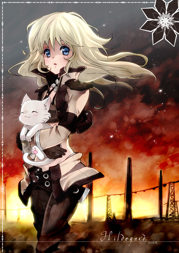 1girlanimalartist nameblack glovesblack pantsblonde hairblue eyesblushbrown jacketcatcowboy shotflat chestglovesholdingholding animalholding catjacketlong hairlong sleeveslooking at vieweropen clothesopen jacketopen mouthpantspower linessmokestacksolotransmission towerwhite cat