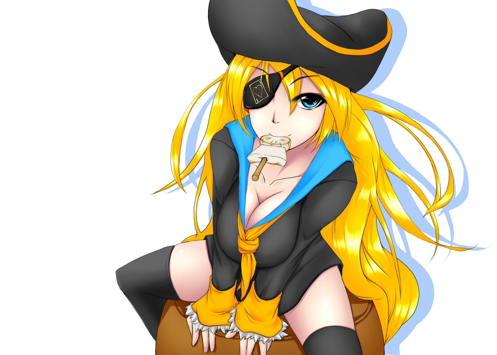 1girlaged upbarrelblonde hairblue eyesblue sailor collarbreastscardcleavagedresseatingeyepatchfoodhair between eyeshatheartlarge breastslong hairlooking at viewerpiratepirate hatsailor collarsailor dresssimple backgroundsittingsolowhite background