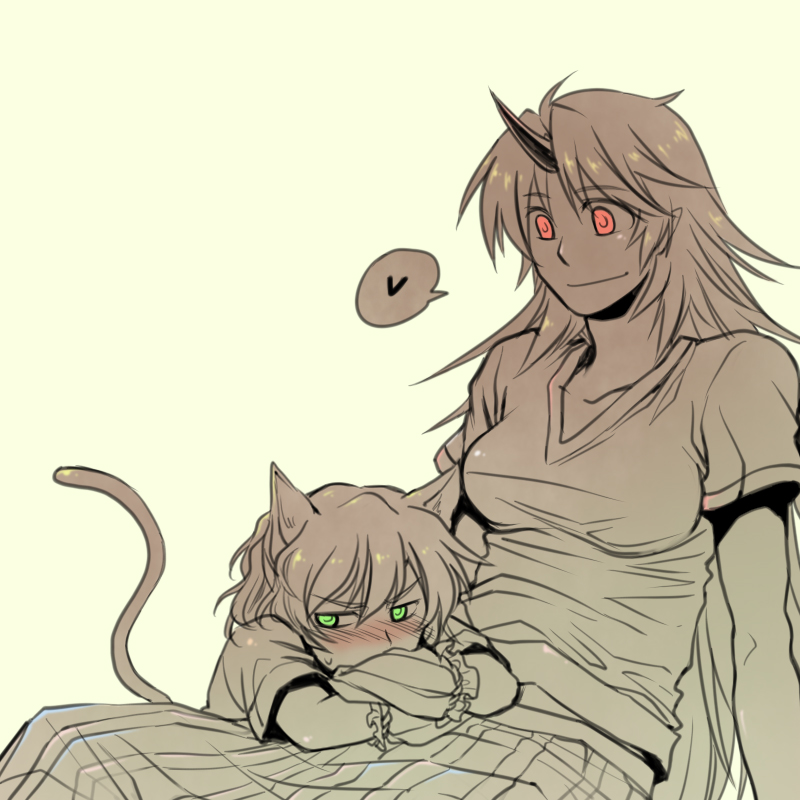 2girlsanimal earsblushcat earscat girlcat tailfemale focusgreen eyeshornskemonomimi modemonochromemultiple girlsred eyessingle hornspot colortailyellow backgroundyellow themeyuri