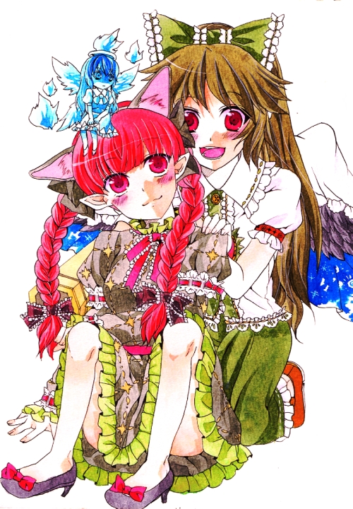 3girlsanimal earsblushbrown haircat earscat girlfemale focusmultiple girlsred eyesred hairribbonskirtwhite background
