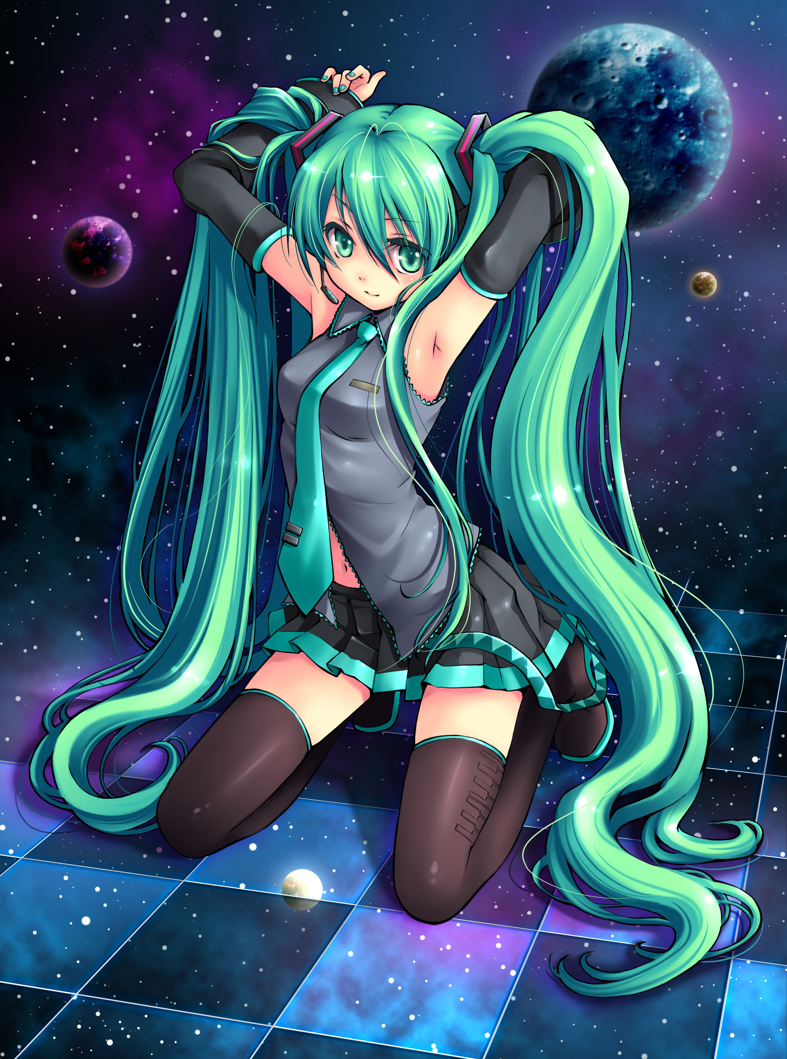1girlarmpitscheckered floordetached sleevesfemale focusgreen eyesgreen hairgreen nailsheadsetkneelinglong hairlong legsmatching hair/eyesmoonnail polishnavelnecktieperspectiveplanetskirtsolostar (symbol)thighhighstwintailsvery long hairzettai ryouiki
