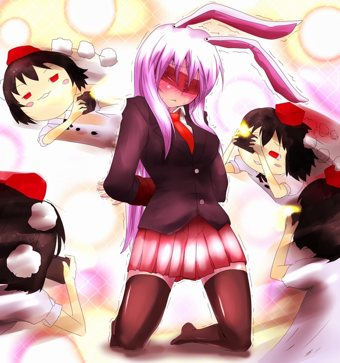 1boy2girlsanimal earsbdsmblack hairblack thighhighsblazerblindfoldblushbondageboundcameracolored blindfoldcruelty to animalsfemale focushatjacketlong hairmultiple girlsnecktiepleated skirtpurple hairrabbit earsred necktieshort hairskirtthighhighstokin hatyukkuri shiteitte ne