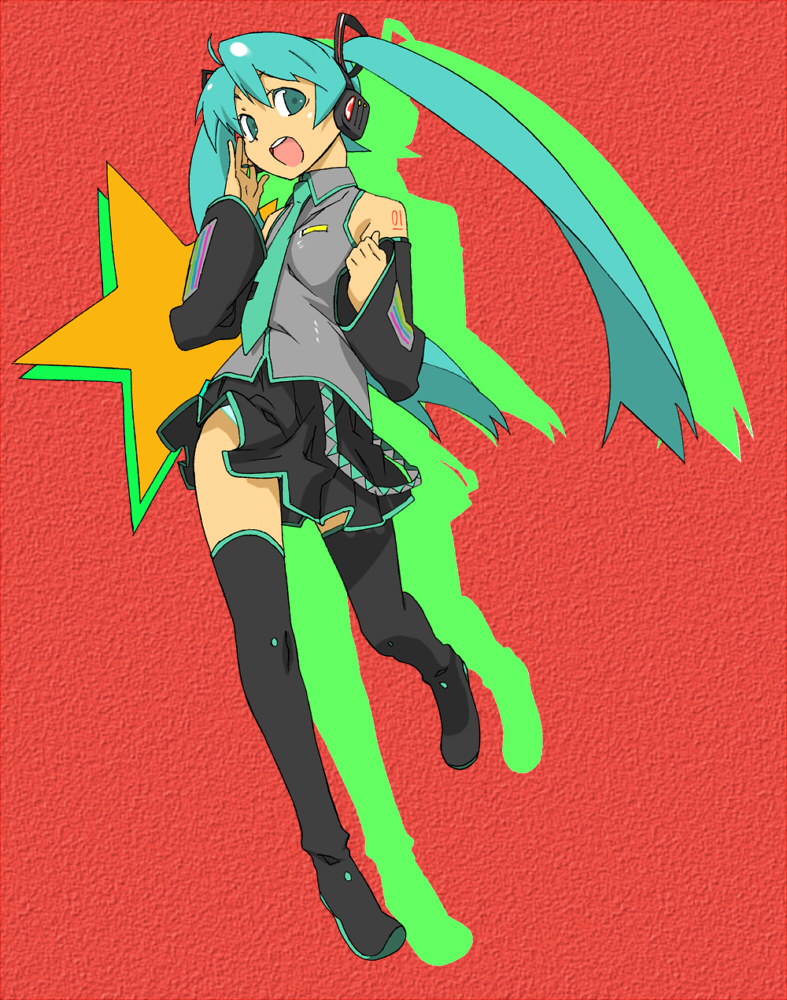 aqua eyesaqua hairdetached sleevesheadphoneslong hairnecktiepantiesskirtsolothighhighstwintailsunderwearvery long hairzettai ryouiki