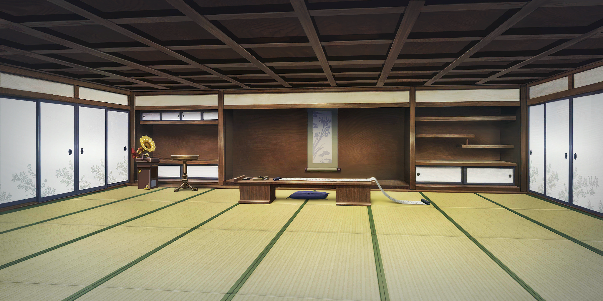 architecturecushiondeskeast asian architecturehanging scrollindoorsinkstoneno humanspainting (object)phonographround tablescrolltabletatamiwooden desk