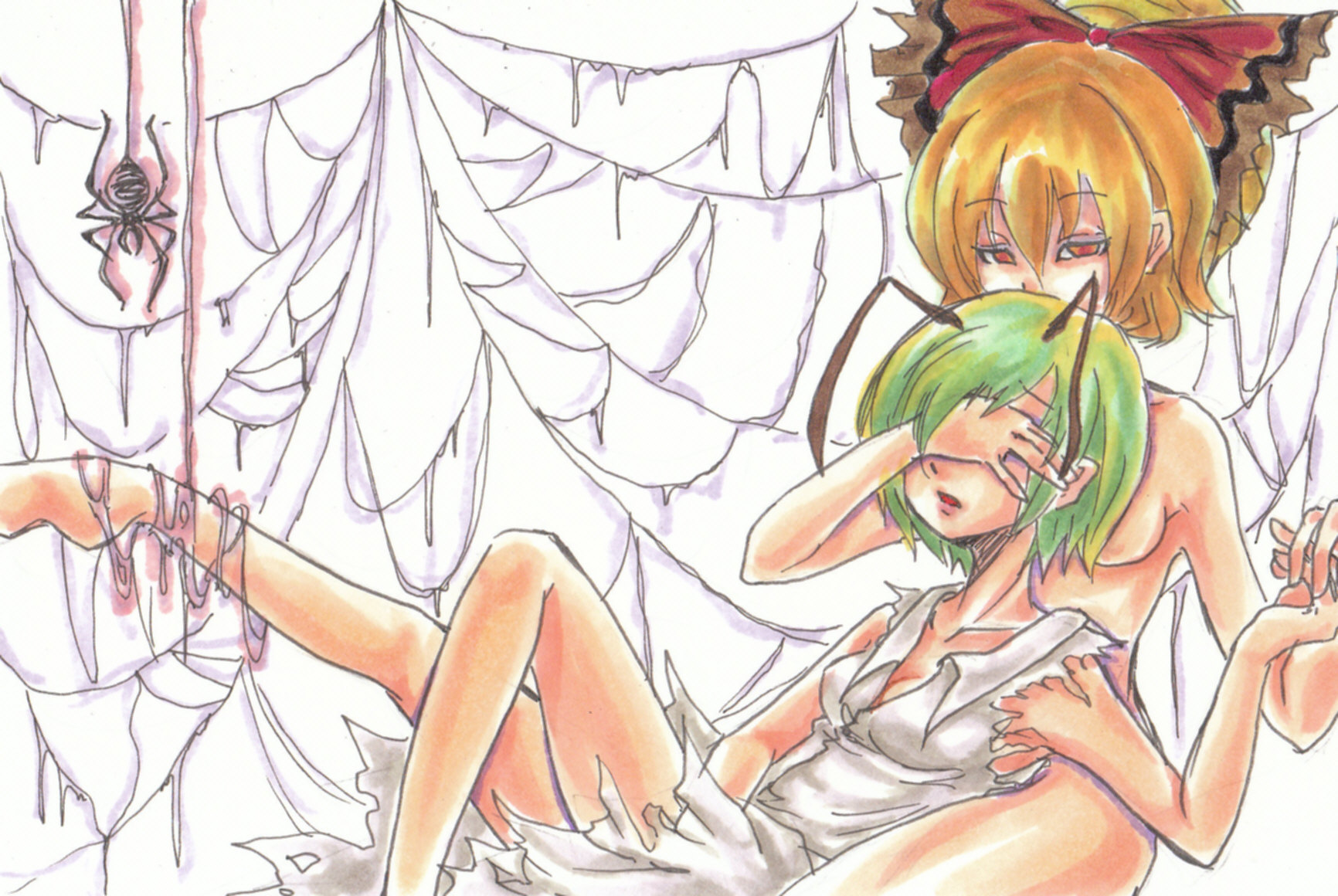 2girlsantennaebarefootblonde hairbowbreastscleavagefemale focusgreen hairhair bowmultiple girlsnudeopen mouthred eyessilkspider webtorn clothesyuri