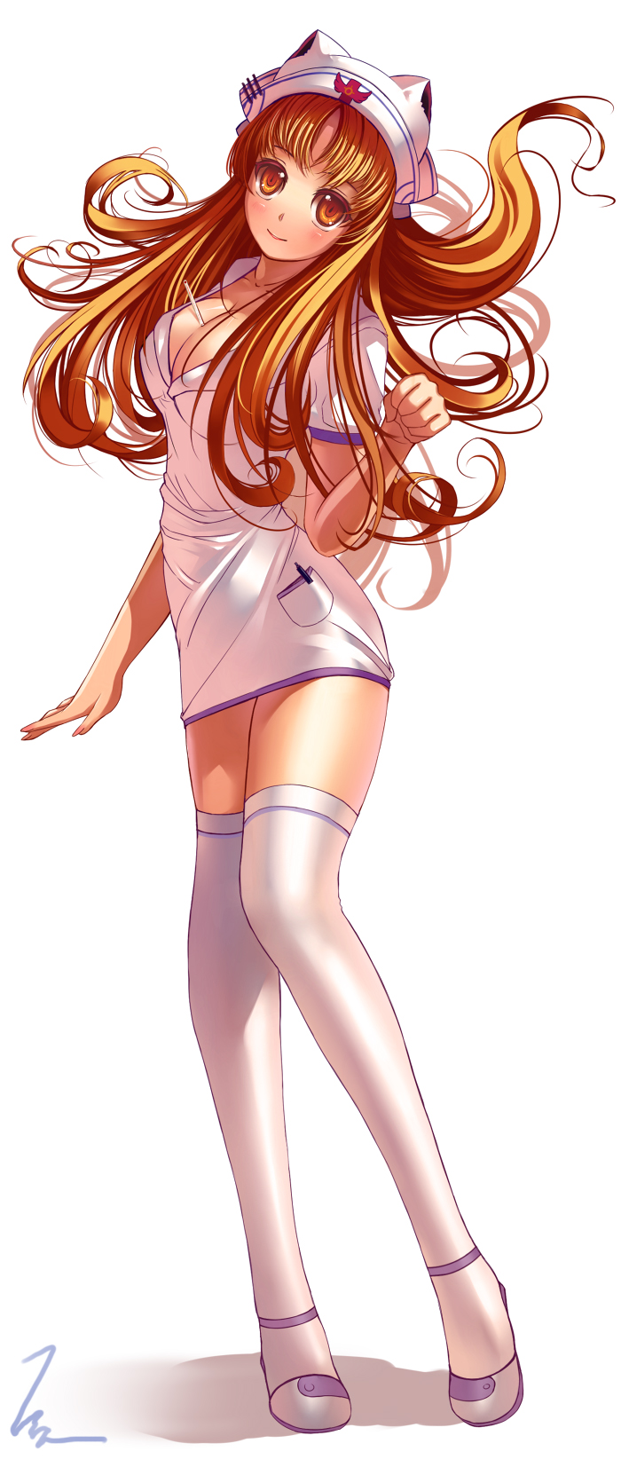 1girlbetween breastsbreastsbrown eyesbrown haircleavagefemale focushatlong hairlong legsnursenurse cappaw posesmilesolothighhighs