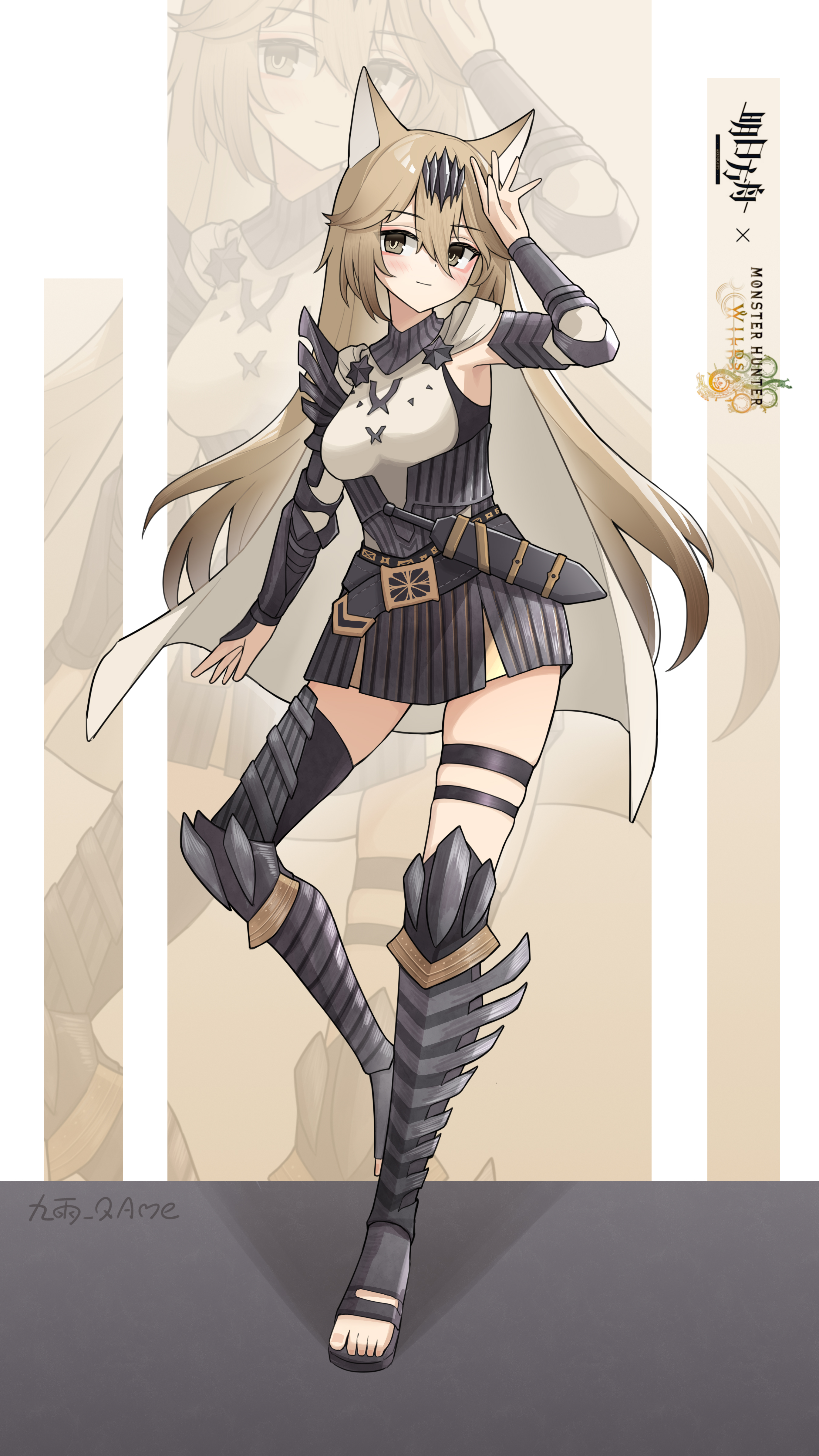 1girlalternate costumeanimal earsarm uparmorarmored bootsblack eyesblushbootsbrown haircopyright namedaggerfull bodyhair between eyeshair ornamentknifelight blushlong hairsheathsheathedsolostandingthigh bootsthigh straptoesvambracesweaponzoom layer