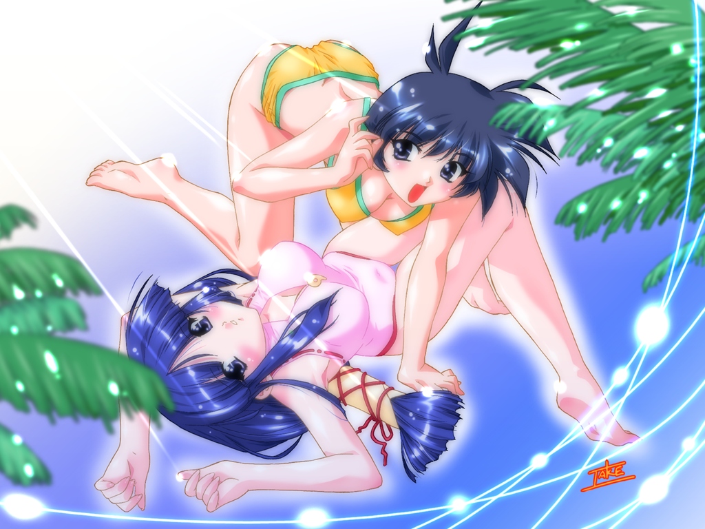 2girlsbarefootbikiniblue eyesblue haircleavage cutoutclothing cutoutlong hairmagatamamultiple girlsone-piece swimsuitshort hairswimsuit