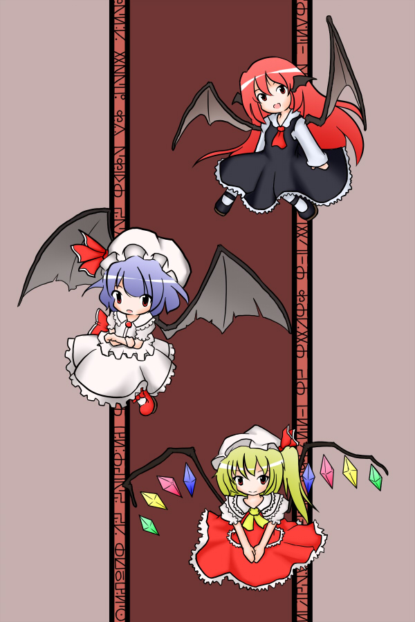 3girlsbat wingsblonde hairblue hairchibidressfemale focushathead wingslong hairmultiple girlsred eyesred hairshort hairskirtwings