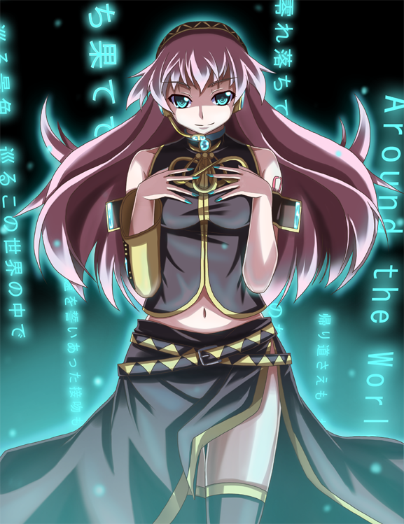 1girlaqua nailsbeltblue eyesfemale focusheadsetlong hairmidriffnail polishnavelpink hairsolothighhighs