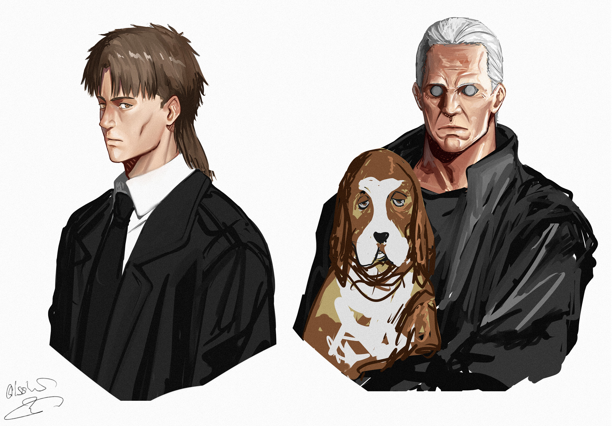 2boysartificial eyebasset houndblack coatblack jacketblack necktieblack shirtbrown dogbrown eyesbrown haircoatdogfrom sideholdingjacketlooking at viewermulletmultiple boysnecktieportraitshirtshort hairsimple backgroundstraight-ont-shirtwhite hair