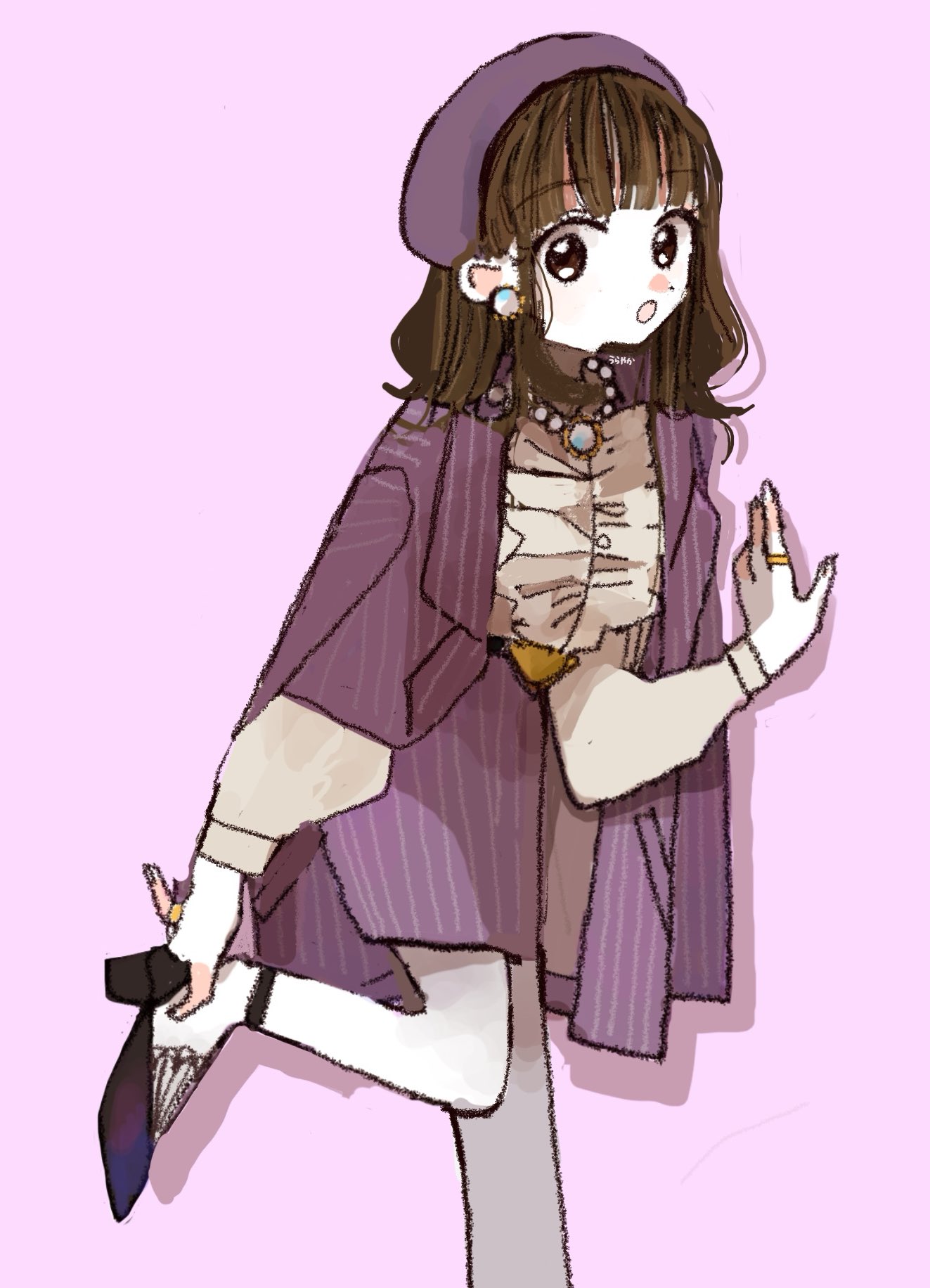 :o1girladjusting footwearberetblunt bangsbrown eyesbrown haircoatearringsfingernailsfrillshand on wallhatjewelrylong sleevesnail polishnecklaceopen mouthpearl necklacepurple backgroundpurple coatpurple skirtringsidelockssimple backgroundskirtsockssolostriped clothesstriped coatstriped skirtwhite nails